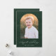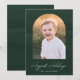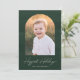 Trendig, modernt helgdag-fotokort med din favoritbild inuti en båge ram med en bakgrund av vattenpenseldrag för mörk hunter grönt. Uttrycket "Happiest Helgdagars" visas i ett vitt, modernt, handskrivet teckensnitt med familjens namn som visas nedan. Baksidan av fotokortet för helgdag av chic har en vattenfärgsteckendesign för grönt av mörk-jägare.