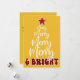 Det här julkortet har ordet "Merry" i en charmig handskriven stil, arrangerad i ökande storlek från topp till botten för att bilda formen av en julgran. Nedan sticker "& Bright" ut i fet, retro, klumpig, 70-talsinspirerad text, vilket ger designen en lekfull och rolig touch. I toppen av granen sitter en ljus handritad röd stjärna som stärker kortets festliga och kreativa tilltal mot en djup gyllengul bakgrund.