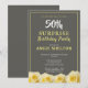 Modern 50-års födelsedagsinbjudan för henne. Födelsedagsinbjudan med vackra gula rosor. Bakgrunden är grå. Texten är i vit och gul färg och är lätt att anpassa - anpassa den med ditt namn, ålder, datum, plats och RSVP. Perfekt för en kvinna som firar sin femtioårsdag. Inbjudan till 50-års överraskningsfest.