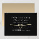 Lägg märke till bröllop i tidlös stil med det moderna svarta och guld spara datumkortet. Med ett romantiskt guld-rep-hjärta, elegantens kalligrafi och en fet svart bakgrund, får du en sofistikerad ton för speciella dag. Anpassa det med namn och bröllop-datumet för att skapa ett varaktigt första intryck som dina gäster kommer att göra i kärlek.