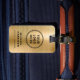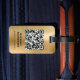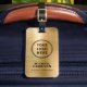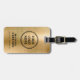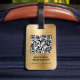 Modern bagagemärke för professionellen med företagets eller organisationens logotyp och QR-kod på en guld-fack-metallbakgrund. Lägg till ditt namn och din titel i enkel typografi.