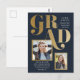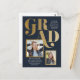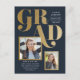 En kombination av examensmeddelande och inbjudan med flera fotoöppningar, fet typografi i en modern asymmetrisk layout.