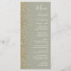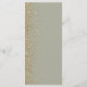 Den vänstra kanten på denna eleganta moderna bröllopsmeny har en guld falsk glitterdesign. Den anpassningsbara texten kombinerar elfenbenshandstil, kopparplåt och kursiva teckensnitt på en salvia grön bakgrund. Baksidan har en matchande salvia grön och guld glitterdesign.