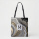 En väska med en abstrakt utformning med ett agate geode mineral mönster. Guld, grått, vit och svart vridning som tillsammans bildar eleganten vågar om färg. En lätt grått-kvadrat med ett tunt svart gräns överkant med ett inledande monogram inuti. Perfekt för att förmedla en luft av klass och elegans.