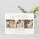 Moderna antika kungörelsekort för guld och vitt bröllop spara datum har en kollage av tre bilder med fyrkantig förlovning och en snyggt med kalligrafi av chicen och hjärtaccenter. Den enkla och elegant anpassningsbar som kan vara helt personlig med det numeriska datumet för bröllop, briden och groom namn, platsen för ceremonin, bröllop webbplats och en formell inbjudan att följa ordalydelsen.