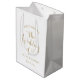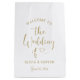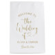 En premium skräddarsydd bröllopsgåvpåse med "Välkommen till bröllopet" i flytande guld hjärtskrift med en delikat hjärtformad sväng, tryckt på båda sidor. Paret namn och bröllopsdatum visas i varma, koordinerade guldtoner. All text är helt anpassningsbar. En elegant välkomstpåse för bröllopsgäster, redo att fyllas med resplaner, godsaker och lokala favoriter för hotellrumsankomster.