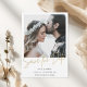 Gör ett glamouröst första intryck med vår Moderna guld kalligrafi foto bröllop Bevara datum. Denna design balanserar perfekt modern minimalism med en touch av lyx, med ditt favorit engagemangsfoto överlagt med elegant, handskriven guldsnrift. (tryckt guld-färgad effekt) Det är ett snyggt och sofistikerat sätt att meddela ditt datum till vänner och familj.