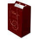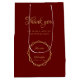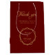 Denna moderna geometriska påsväska för bröllop (i form av en presentpåse) kombinerar 2 trender från 2019: geometriska och metalliska (guld). På den finns en oregelbunden ram av två gula hexagoner som överlappar varandra på en vinröd bakgrund, med namnen på bruden och brudgummen och datumet inuti. Titeln "Tack!" ovanför och namnen på bruden och brudgummen är skrivna med en elegant kalligrafisk stil. Under titeln "Tack" finns i mindre versaler ett meddelande som säger "för att du var en del av vår speciella dag!" som kan ändras och anpassas. All text har en gyllengul färg, likt den gyllene ramen.