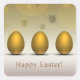 En abstrakt och en modern påskillustration som presenterar 3 guld- påskägg på en bokehbakgrund med abstrakt blommor.