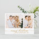 Modern Elegant Script 2 Photo Collage julkort. Detta festiva, minimalistiska multifotojulkort har söt 2-rasterfotokollage, guld glitter-konetti, en "God jul" hälsning-text som är skriven i en handskriven kalligrafi eller typografi-swash svan-typsnitt i guld och vitt. På motsatt sida hörn av glitter konfetti och förformat meddelande. Hälsningskort för söt till din familj och dina vänner på Winter-Julhelgen.