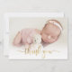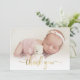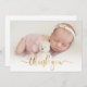 Enkelt Modern Elegant Calligraphy Guld Script Photo Newborn Baby Tack Birth Announcement Card. Har en vacker "tack"-text i ett handskrivet calligraphy swash svan font script i FAUX guld-folie. Förskapat personligt meddelande på baksidan. Underbar för flicka eller pojke. Enkel att anpassa med ditt baby-foto och din information.