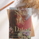 Ett modernt spara datum meddelande med ditt favoritfoto övertäckt med "spara datumet" i det moderna teckensnittet för serif-visning i guld. Färg i detta är redigerbart.