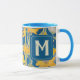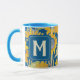 Solblommor med ljusa körsbärsfärger i gult dekorerar detta konstnärliga monogrammade kaffe mugg med din anpassningsbar först på blå bakgrund. Designad av världsberömd konstnär ©Tim Coffey.