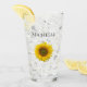 Modern solrosglas, med en söt gult solrosblomma. Med svarta bokstäver kan du anpassa med egen text.