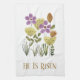 Han är borta. Kökshanddukar för återuppbyggandet av Söndag Påsk med en vacker modern blommigt med lila och gult Påsk färg. Du kan ändra stilar/färg.