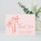 Lägg till en levande och modern twist till dina anteckningar efter bröllop med den här djärva tacksamhetsdesignen. Handdragen orange handflatan träd och en glad bakgrund för rosa anger tonen för roligt, tropiskt firande. "Tack" visas i ett snyggt-skript, med utrymme för att lägga till datum för namn och bröllop på framsidan och ett anpassningsbar-tack för ett meddelande på baksidan.