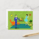 Det här Mid Century Modern Couple Postcard ser ut som en scen ut ur en romantisk komedi. 1960-talets minimalistiska konstdesign i stil har ett attraktivt tecknad par som njuter av en romantisk kväll hemma. I det sofistikerade rummet finns en grönt stenvägg med en brinnande eld i eldstaden. Inredningen i rummet omfattar en orange, en sittplatshållare med tillhörande fotavföring, en röd, startväggsklocka, en gult, en sputnik-ljusfixtur och en orange Sida bord, som är hem för en bärbar spelare i grönten. På golv bredvid bord kan man se en vinylpost som visar ett kitschybäcken. I mitten av gröntens golv finns det ett stort, rektangulärt, teal matta. I mitten på scenen har vi ett mycket sofistikerat par. Det finns en suave-man i royalet blå kostym, vit skjorta och blå bockslips. Den höga, mörk och stilige mannen blickar på sin vackra kamrat. Eleganten, korvhögen kvinna bär en flockakvattklänning. De har vardera ett kristallmartiniserat glas med flytande oliver. Skål! Här är perfektens kväll hemma!