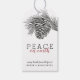 Designen har en handritad teckning av en tallgren med kotte, "fred på jorden", företagsnamn i modern och skrivstil.
