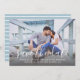 Meddela din bröllop på stil med dessa moderna "save the date"-kort som visar er förlovningsbild med en vacker överlagring i elegant och lekfullt typsnitt. Inkluderar modern anpassad text som kan personifieras på framsidan med alla viktiga detaljer, tillsammans med ett koordinerande mönster av horisontella handritade ränder på baksidan med en dammig blå (kan modifieras) bakgrundsfärg. Notera, det mörka fotofiltergradienten kan tas bort.
