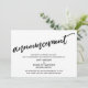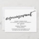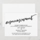 Denna svits utmärkande beror på det moderna, handskrivna typsnittet som används för accentfraser. Om du behöver låta dina gäster veta att ditt bröllop har ställts in, ger detta kort ett djärvt, iögonfallande alternativ. I denna del användes det handskrivna typsnittet för att skapa en enkel grafik som visar ordet "announcement". Använd mallfälten för att lägga till dina personliga detaljer och gör denna unika, moderna design till din egen. Den vita bakgrunden kan ändras till valfri färg du föredrar. Vänligen kontakta oss med eventuella specialförfrågningar eller för anpassningshjälp. // 100 //
