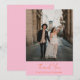 This wedding thank you card features a large couple photo with a warm pink panel below showing a flowing orange script "Thank You" and the couple's names. A heartfelt, colorful way to thank guests after the wedding that feels just as bold and joyful as the rest of the suite. Photo and all text are fully editable.