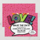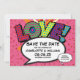 Med kärlekshjärten konfetti, ett roligt, coolt och trendigt serieinspirerat spara datum-kort som sätter wham, zap, pow i din bröllopsdatum tillkännagivande. Baksidan har matchande kärlekshjärten konfetti på ett rosa serie prickmönster som du kan ersätta med din egen bild eller foto. Designad av Thisisnotme©