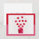 Modern konstnärlig Alla hjärtans dagskort med röd / rosa färgblock bakgrund med mittbilden av röda hjärtan som flyter ut från ett kuvert. Anpassningsbart Alla hjärtans meddelande på baksidan