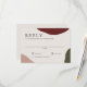 Ett konstnärligt stilrent bröllopssvarskort som förmedlar enkel elegans, denna design har en rik höstfärgspalet i burgunder vinröd, terrakotta och jägare gröna abstrakta former längs kanterna av designen. En ecru bakgrund passar bra med höstfärgerna. Teckensnittet är krispigt och elegant i sin enkelhet. Anpassa med ditt obligatoriska svarsdatum för RSVP.