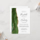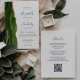 Den här elegantens lämnat kant har en modern bröllopsinbjudan med en grönt som är en som är en jägare och som är vattenfärgad i gräns som trimmas med faux guld glitter. Anpassadet kombinerar handskrift, tryckplåt och kursivt typsnitt i grått i kol mot vit bakgrund. Den omvända sidan ger plats för bröllop-information på en solid vit bakgrund, tillsammans med en QR-kodgäst som kan söka på webbplatsen och OSAN, vilket sparar kostnaderna för utskrift och utskick av separat OSA kort.