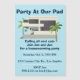 Mid Century Modern Homeuppvärmningspartis inbjudan. Huset är av det slag som vi sett i Sydkalifornien med texten "Party at our Pad" och "Anropa alla coolor" för det där halvseklet slang vibe.