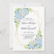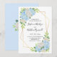 Dessa brölloppsinbjudningar har en akvarell blomsterdesign med blå hortensior, vita rosor och bladverk med en falsk guldgeometrisk ram. Anpassa inbjudantexten med din egen text.
