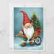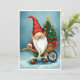Lägg till lite julhumor i dina önskningar med detta moderna vykort! Illustrationen visar en rolig tomte med en trädgårdsskötselsskrinda som innehåller ett vackert dekorerat julgran med glaskulor. Den färgrika, fantasifulla och charmiga designen gör detta kort till ett idealiskt val för människor som älskar unika mönster.