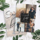 Ta din 5 bästa bilder från förlovningens fotosession med 4 för framsidan och en för baksidan. Den har en handskriftssymbol som säger Spara datumet.