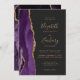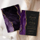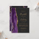 Den lämnat kant i eleganten i den moderna bröllopsinbjudan har en lila vattenfärgsagat gräns som trimmas med faux guld glitter. Med anpassadet kombineras handskrift, tryckplåt och kursivt typsnitt med guld färgad på en mörk grått-bakgrund. Den omvända sidan har en matchande lila- och guld-agate-design.