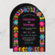 Denna moderna inbjudan till gigantiskt gigantiskt bröllop är djärvt och dynamiskt och har en slående svart bakgrund som är perfekt kontrasterad av en färglös handmålad blommigt ram inspirerad av traditionell mexikansk folkkonst. Rikens nyanser av rött, gult, rosa, orange och turkotisk blomning runt gräns, vilket skapar en festlig men elegant utformning. De levande blommigtarna ram i det centrala textområdet skapar detaljerna i firande med en sofistikerad och kulturell fläkt. Perfekt för ett par tittar att förse bröllop med glatt färg och modern elegans som är rotad i traditioner.
