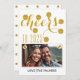 Modern befaller till 2025 års platta fotokort för guld glitter i bollar. Det visningar texten "Cheers to 2025" i guld glitter med guld bollar med metallskina och ett foto med två guld stift och skugga. Baksidan har en polka punkt mönster i guld punkter på vitt.