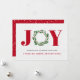 Har en modern JOY-design med grönt andedräkt, personlig med din Julhälsningar och ditt företag namn. Ett modernt men varmt helgdag-kort för kunder, anställda och medarbetare. Baksidan av kortet har vit snöflingor mot en motsvarande röd bakgrund.