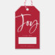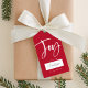 Lägg till en anpassningsbar i dina helgdag genom att lägga till våra märkre för Glatta skriptpresenter. Märkrna för helgdag av anpassningsbar har ord "Joy" i ett vitt, modernt handskript mot djup röd bakgrund. Anpassa genom att lägga till namn eller anpassningsbar. Baksidan har mönster i gräs träd i rött och vitt.