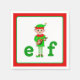 Modern jul musikalisk tomte på vit och röd bakgrund.