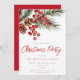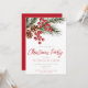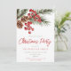 Modern julfestinbjudan med tallbarr, kotte och röda bär med modern kalligrafi
