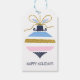 Modern ornamentglödlampa i stil Julgran i mitten av århundradet med oregelbundet rand i ljusblått, simulerat guld glitter, rosa och marint blått med vitt polka dots. Toppad med en simulerad faux glitter-båge och blå och rosa holly. Sätt på vitt fast. Anpassa med ditt namn eller meddelande i mörk blått teckensnitt för serif-handskrift.