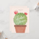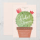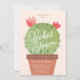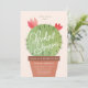 En fantasifull bröllopsinbjudan designad av Stacey Meacham med originell handritad akvarell stickig kaktus illustration med ljusa blomknoppar i en terrakotta kruka.