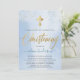 Modern, elegant pojkens Christening-inbjudan med blå vattenfärgsbakgrund, elegant guldkors, typografi-skript Christening i trendy gold-lettering. Om du vill redigera mallen klickar du på anpassa ytterligare.
