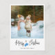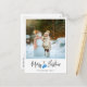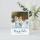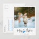 Modern julkort med ett stort foto, kalligrafi stil, blå handskar och personligt meddelande.