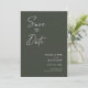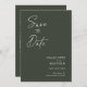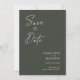 Modern, minimalistisk och elegant "Save the Date"-fotokort i bröllop-förlovningen. I anpassad design finns inslag av modern text med ett unikt kalligrafiskt bläck-skript. Bilden i par markerar baksidan av kortet. Färger skriver vitt om nya oliv grönt eller anpassar enkelt färg vid behov.
