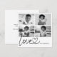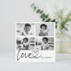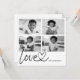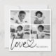 Modern fotokollage med "kärlek" med ansluten hjärta i skript och familjenamn kort.