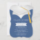 Modern inbjudan till 2014-studentfestens klass med en vit graderingshölje och vit banderoll på en mörk blått marin bakgrund för en högskoleexamen eller högskoleexamen för en pojke eller flicka. Besök vår butik för en mängd olika trendig, populära färg-teman.