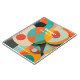 En modern målning i mitten av århundradet i olika geometriska former i rött, teal, orange, svart och grönt med fetstil, vitt namn eller monogram med linjer med 2 extra