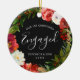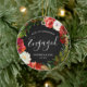 Elegantens fotoutsmyckning med "Vår första jul Engaged" tillsammans med namn och året omgivet av en vattenfärgad blommigt krans med grön, grå och röd och vit blomma över en svart bakgrund. Baksidan har din favorit bild. Behålla den här prydnaden för att fira din förlovning eller ge som en gåva till ett par inför deras första jul.