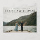 Detta moderna fotots spara datum-kort tillkännager ditt kommande bröllop med stil. Denna produkt låter par visa ett landskaps- eller horisontellt foto utan kanter, anpassa sina namn och evenemangsuppgifter. Ytterligare text finns på baksidan så att du kan lägga till fler evenemangsuppgifter. Detta är ett roligt och prisvärt sätt att skicka spara datum och du behöver inte ens ett kuvert.